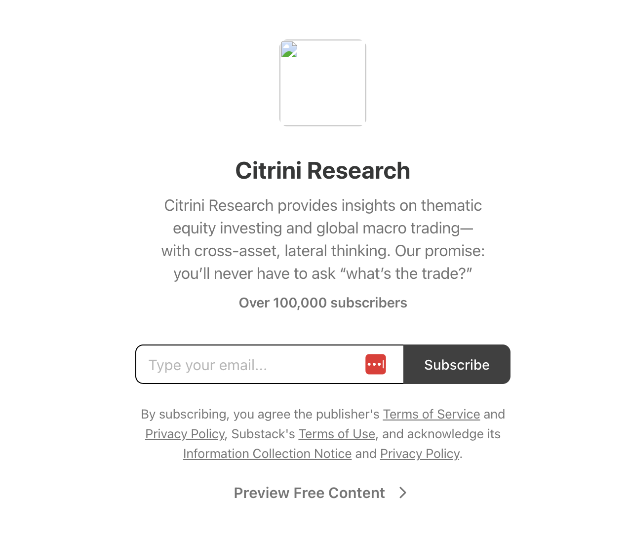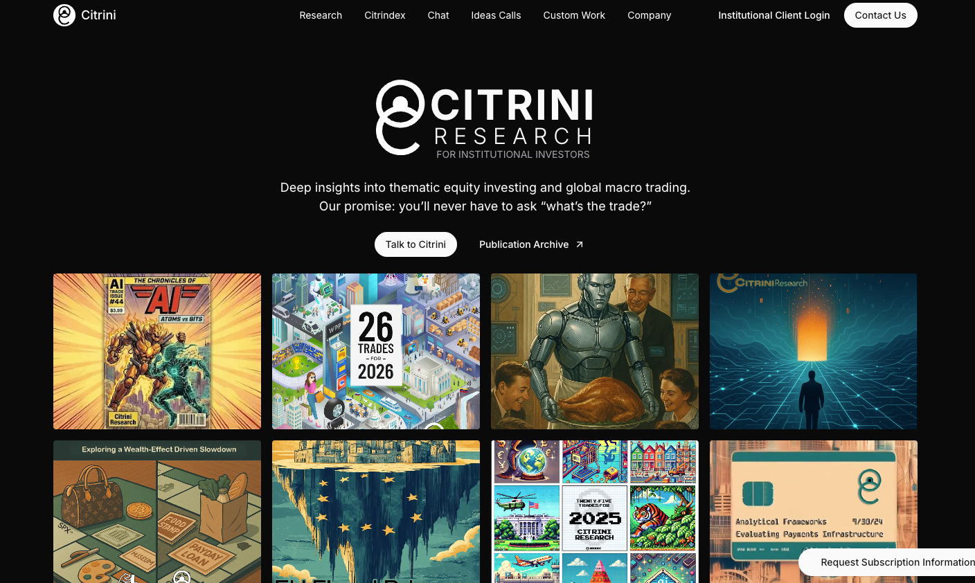 There is a website property, also named Citrini Research, which seems to sit between the two; it offers research for institutional investors along with “idea calls” and “custom work,” which are gated behind a login for clients. Aside from several AI-generated photos, the website has little content to parse.